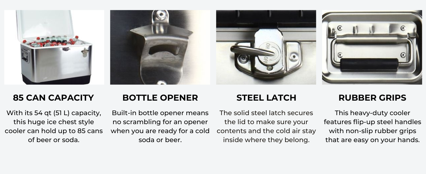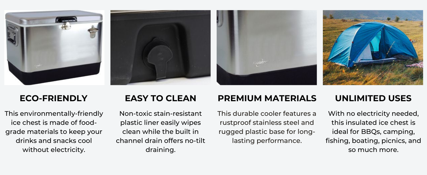 - Durable Construction: Expert craftsmanship and quality materials including rustproof stainless steel exterior and a rugged plastic base mean this ice chest is in it for the long haul