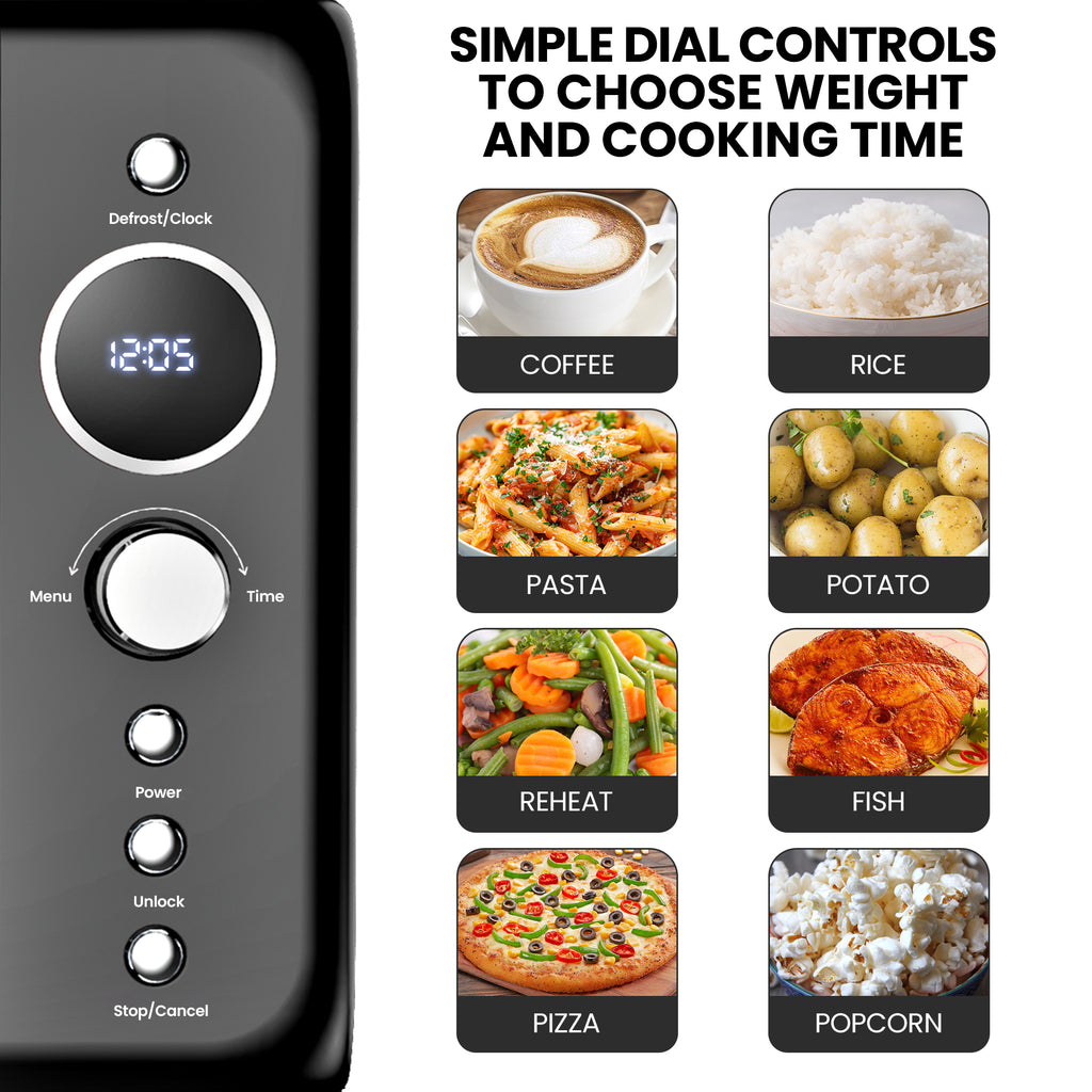 Eye-Catching Retro Look: Add a vintage vibe to your space with this unique retro-style microwave featuring a sleek black finish and shiny chrome accents. Space-Saving Design: Compact countertop microwave with 0.7 Cubic Foot (20L) capacity is the perfect solution for apartment kitchens, office lunch rooms, cottages, RVs, and dorm rooms. 8 Pre-Set Cooking Modes: Choose from 6 power levels or use the 8 pre-programmed functions to confidently reheat or cook coffee, rice, pasta, potato, fish, pizza, and popcorn in this 700W microwave. Easy to Operate: Bright LED display and simple dial and push-button controls, plus Quick Start and Weight/Time Defrost options make operating this versatile microwave oven a breeze. Effortless Cleanup: Exterior easily wipes down and the removable glass turntable and roller ring are dishwasher-safe for quick, hassle-free cleanup |