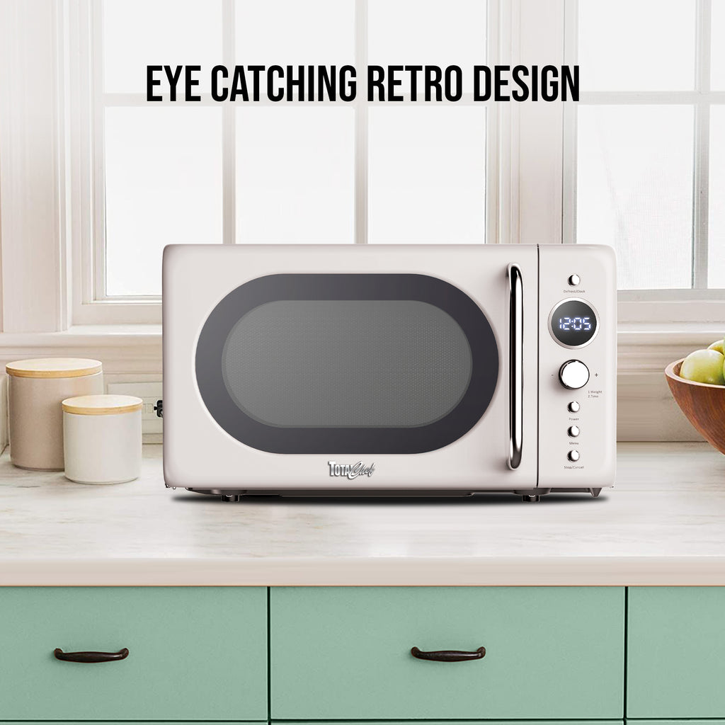 Eye-Catching Retro Look: Add a vintage vibe to your space with this unique retro-style microwave featuring a sleek Cream finish and shiny chrome accents.